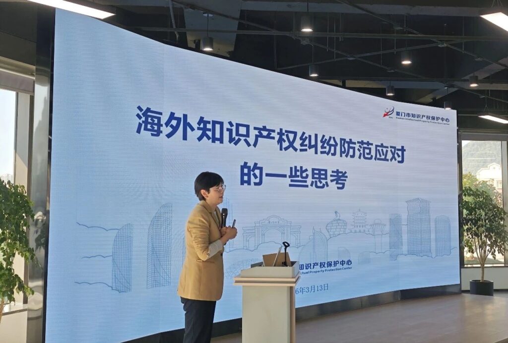 厦门市知识产权保护中心高级经济师张筠以《海外知识产权纠纷防范应对的一些思考》为题,介绍了国家海外知识产权纠纷应对指导中心的工作机制,以及厦门分中心建立的预警体系和三级联动响应机制。